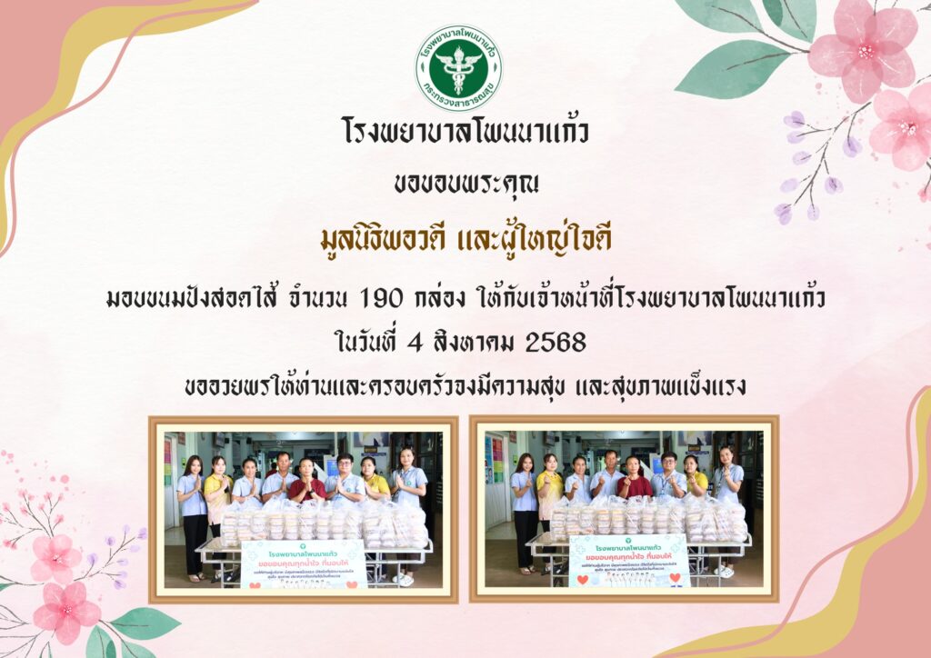 ขอขอบพระคุณ มูลนิธิพอวดี และผู้ใหญ่ใจดี มอบขนมปังสอดไส้ จำนวน 190 กล่อง ให้กับเจ้าหน้าที่โรงพยาบาลโพนนาแก้ว