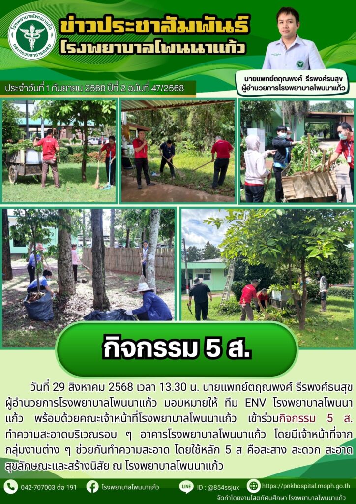 วันที่ 29 สิงหาคม 2568 เวลา 13.30 น. นายแพทย์ตฤณพงศ์ ธีรพงศ์ธนสุข ผู้อำนวยการโรงพยาบาลโพนนาแก้ว มอบหมายให้ ทีม ENV โรงพยาบาลโพนนาแก้ว พร้อมด้วยคณะเจ้าหน้าที่โรงพยาบาลโพนนาแก้ว เข้าร่วมกิจกรรม 5 ส. ทำความสะอาดบริเวณรอบ ๆ อาคารโรงพยาบาลโพนนาแก้ว โดยมีเจ้าหน้าที่จากกลุ่มงานต่าง ๆ ช่วยกันทำความสะอาด โดยใช้หลัก 5 ส คือสะสาง สะดวก สะอาด สุขลักษณะและสร้างนิสัย ณ โรงพยาบาลโพนนาแก้ว