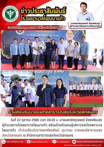 วันที่ 22 ตุลาคม 2568 เวลา 09.00 น. นายแพทย์ตฤณพงศ์ ธีรพงศ์ธนสุข ผู้อำนวยการโรงพยาบาลโพนนาแก้ว พร้อมด้วยตัวแทนผู้บริหารของโรงพยาบาลโพนนาแก้ว เข้าร่วมต้อนรับนายเพทย์พรพัฒน์ ภูนากลม นายแพทย์สาธารณสุขจังหวัดสกลนคร ณ สำนักงานสาธารณสุขจังหวัดสกลนคร