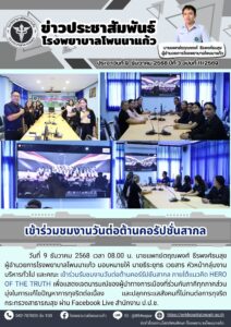 วันที่ 9 ธันวาคม 2568 เวลา 08.00 น. นายแพทย์ตฤณพงศ์ ธีรพงศ์ธนสุข ผู้อำนวยการโรงพยาบาลโพนนาแก้ว มอบหมายให้ นายธีรยุทธ เวยสาร หัวหน้ากลุ่มงานบริหารทั่วไป และคณะ เข้าร่วมรับชมงานวันต่อต้านคอร์รัปชันสากล ภายใต้แนวคิด HERO OF THE TRUTH เพื่อแสดงเจตนารมณ์ของผู้นำทางการเมืองที่ร่วมกับภาคีทุกภาคส่วน มุ่งในการแก้ไขปัญหาการทุจริตต่อเนื่อง และปลุกกระแสสังคมที่ไม่ทนต่อการทุจริต กระทรวงสาธารณสุข ผ่าน Facebook Live สำนักงาน ป.ป.ช.
